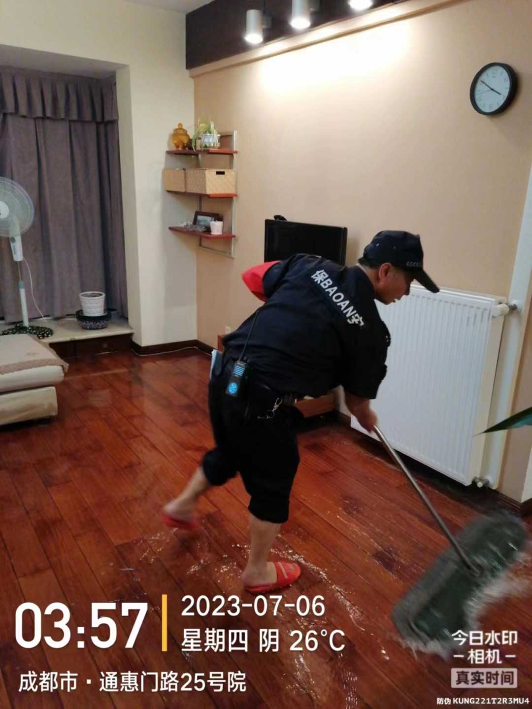 2023年7月6日凌晨3点6分,长富新城1号岗值班员郭正庭接到3栋2单元16楼3号业主紧急电话,告知17楼3号漏水至楼下,要求去查看。随即通知值班维修工钱富国一起快速赶到现场,只见17楼3号门前有大量水冒出,已流至电梯门口。紧急敲门、按门铃均无应答。对此,大家在现场紧急处置,不让水流进电梯;同时郭正庭向黄建兵经理报告,再与关系人联系,想办法查找到业主电话。经与业主联系,得知不在成都,现在河南老家,家中无人。针对现场情况,在沟通中明示处置突发爆管需门锁密码,业主将信将疑,在与业主反复沟通后,业主将门锁密码告知邻居。开门后发现屋内积水已达5公分左右,确系水管爆管漏水所致。情况紧急,大家涉水关闭室内供水总闸阀,切断水源,同时增调保安人员到现场,大家对屋内积水快速进行排水清理,以减少渗水到楼下。经过2小时努力抢水救援奋战,排净和拖干了室内积水,排除险情,保障楼下业主不被漏水影响,同时减少了爆管业主的损失,保障电梯安全;受到业主的称赞!