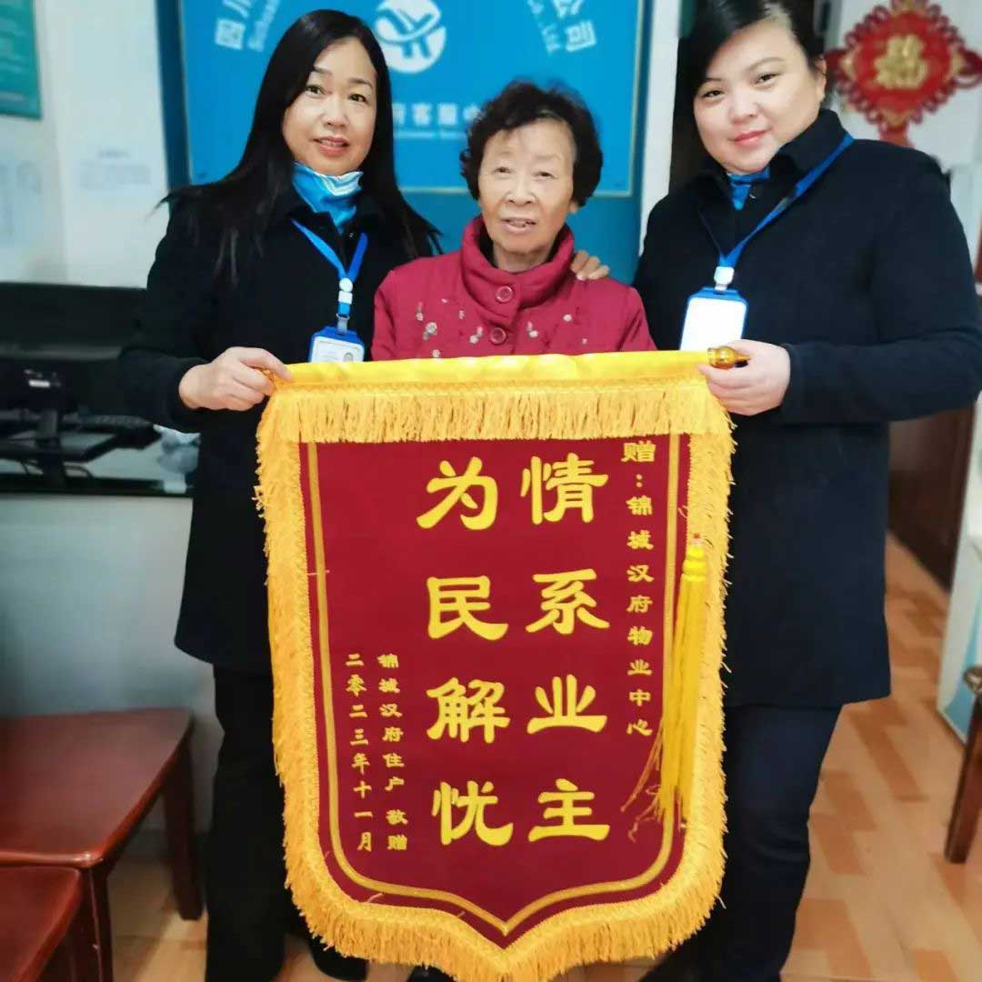 2023年11月30日,锦城汉府1栋904号业主李成成来到物业服务中心赠送绣着“情系业主、为民解忧”的锦旗,感谢项目管理人员经常为其热情服务,解忧解难;工程人员及时维修水管、电器、整理小花园,帮助老年业主解决日常生活中出现的各种问题。
